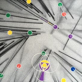 In this series, I explore the outcome of placing diagrams on random coordinates. Whilst these coordinates are defined by random gestures, the diagrams are precise extrapolations of Kandinsky’s study in Point and Line to Plane on colour and shape association. Together and in conjunction with more random integrated factors (e.g. the throw of dice), these systems progress the work towards its completion, which is determined by the coordinates being used up.