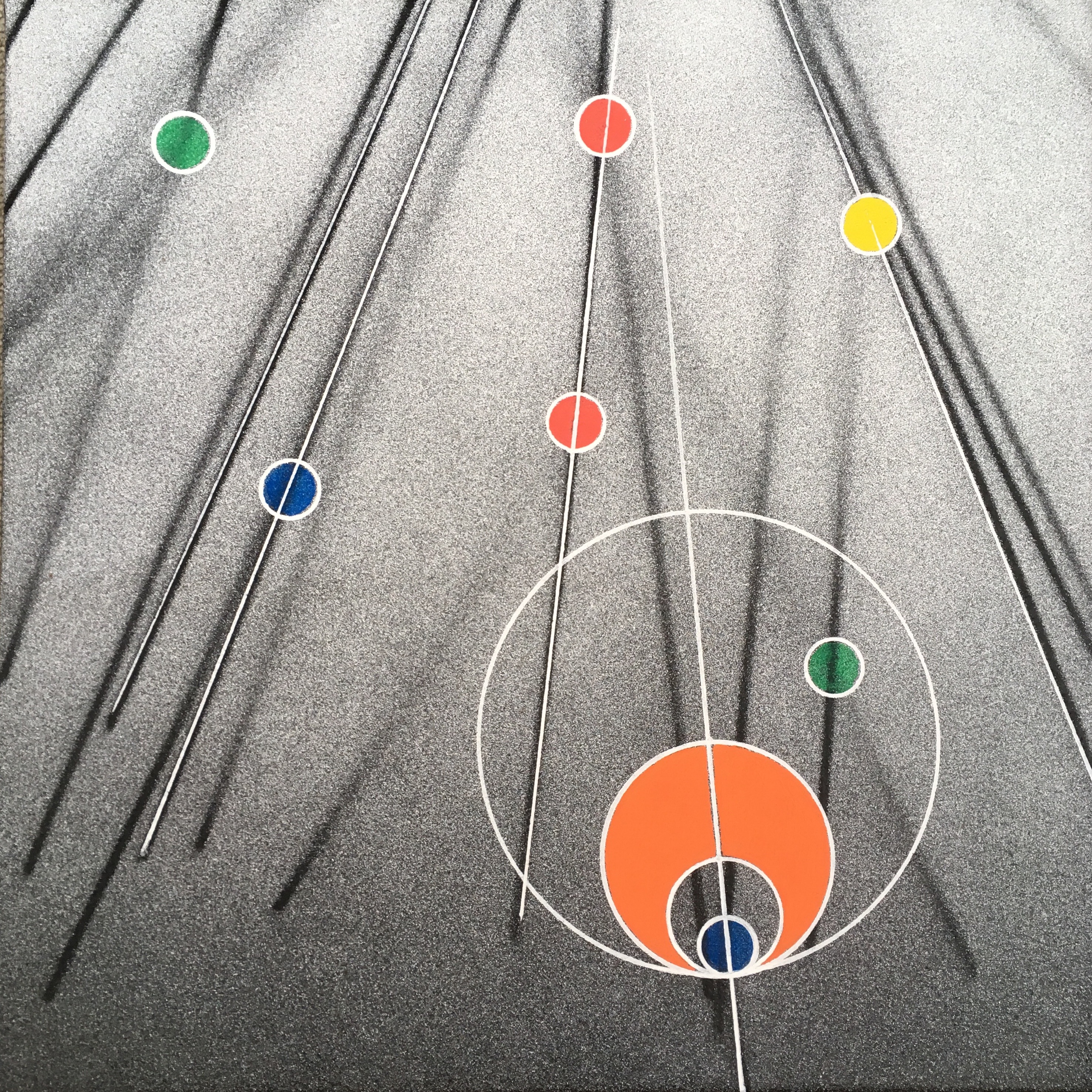 In this series, I explore the outcome of placing diagrams on random coordinates. Whilst these coordinates are defined by random gestures, the diagrams are precise extrapolations of Kandinsky’s study in Point and Line to Plane on colour and shape association. Together and in conjunction with more random integrated factors (e.g. the throw of dice), these systems progress the work towards its completion, which is determined by the coordinates being used up.