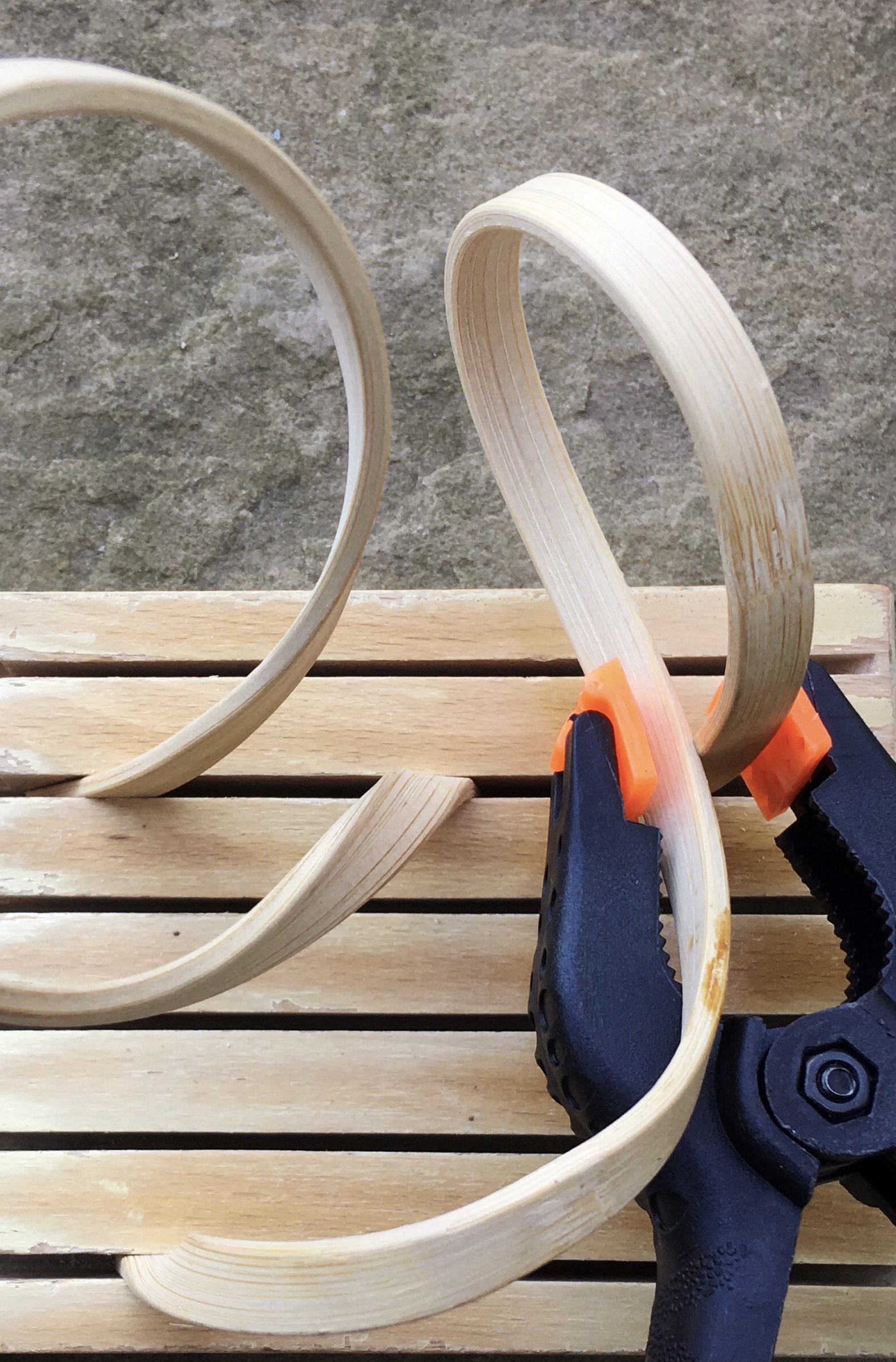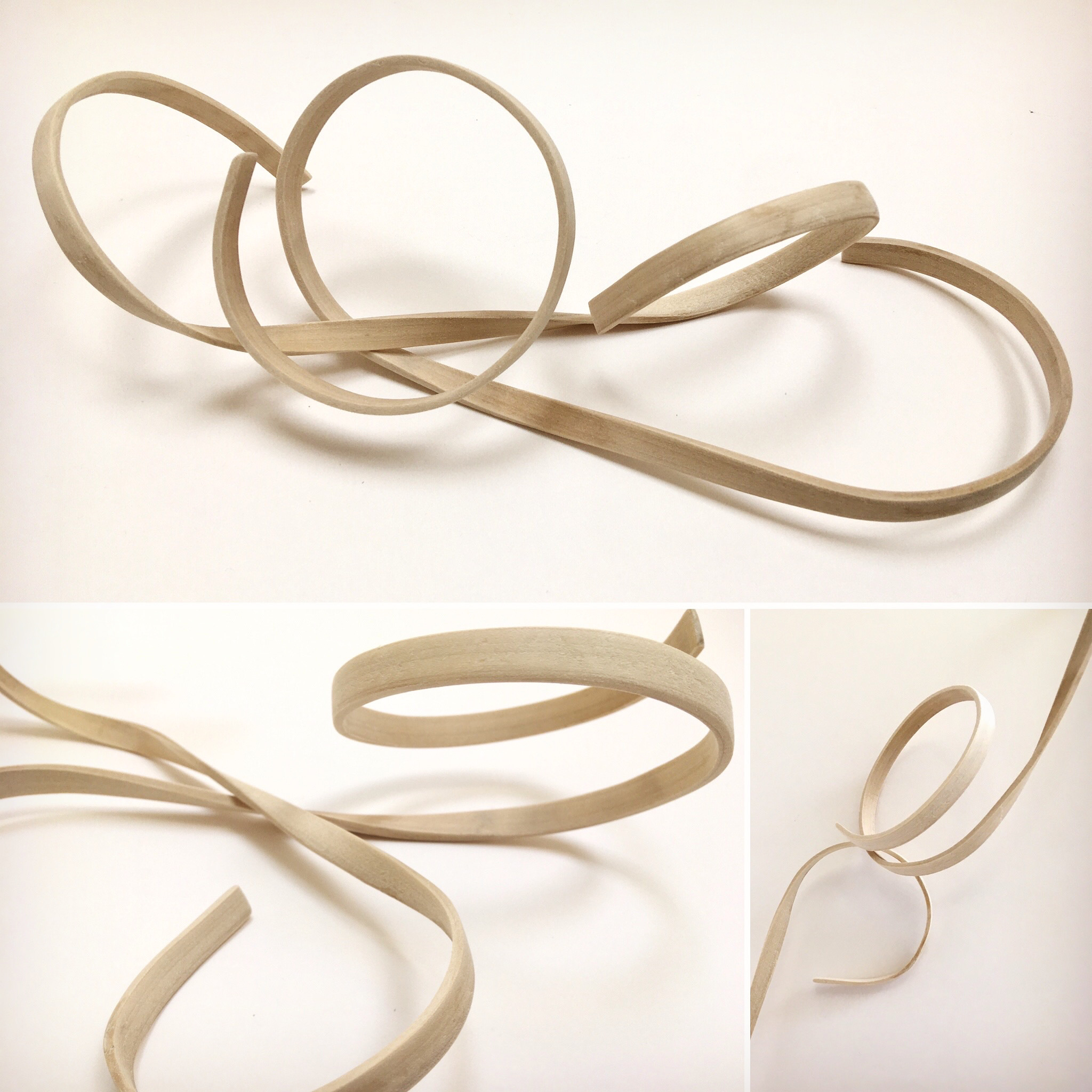 The wood strips are off-cuts from the local sawmill. The bending process does not involve steaming per se, as it draws up a lot of energy. Instead I use a tray to soak the wood over time and then iron it. The water soaked up by the wood heats up very quickly and prepares the wood for bending. This process is not as reliable as steaming the wood in a box (above images). There is a lot of breakage and I am limited with the thickness of the wood – I cannot bend strips of wood over 5mm thick. However, most of the broken parts are used in the work and the energy consumed in this process is a fraction of what it would be with steaming. As for the thickness of the wood, it means my work is very light, making it easy to hang and transport, with a low overall carbon footprint.
