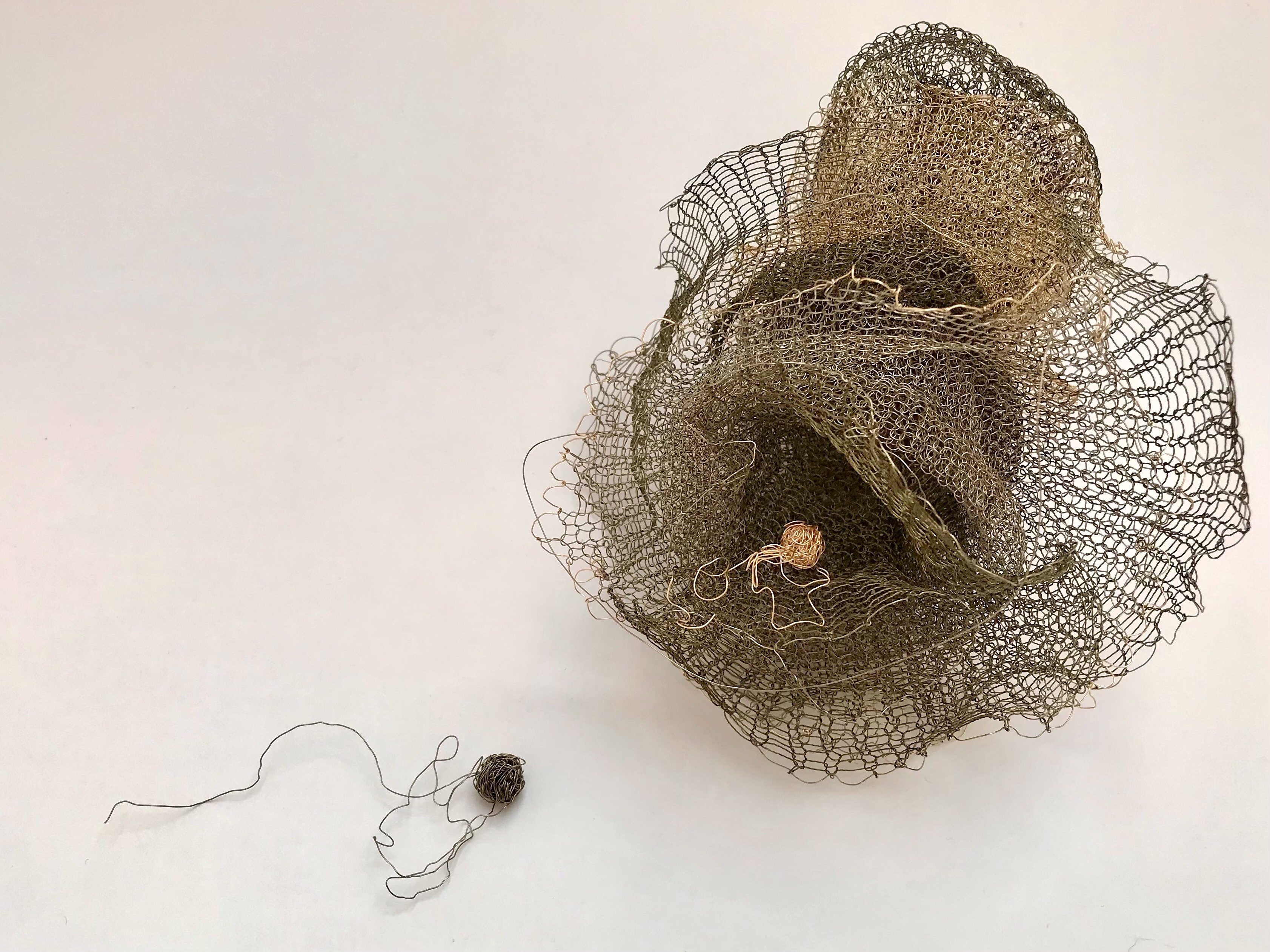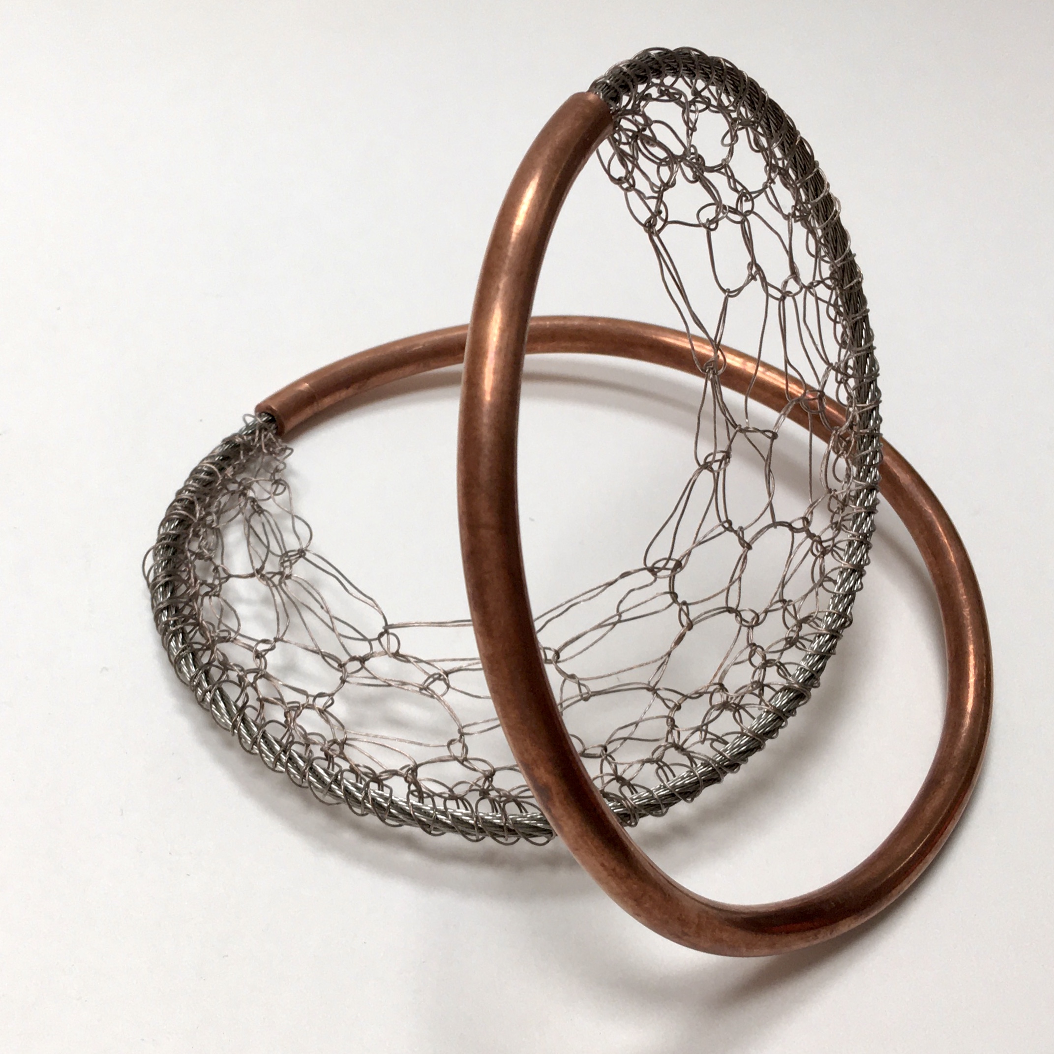 Since needle work is traditionally associated with materials such as wool or string, and with activities such as making, mending or decorating (mostly of the cloths category), there is a visual expectation around both the nature of the material and the appearance of a knitted outcome (e.g. a jumper is soft and floppy). The malleability of the copper may mislead the viewer into thinking the material used in the knitting is a conventional knitting material, but the three-dimensional structure disrupts this assumption and encourages the viewer to have a closer look.
